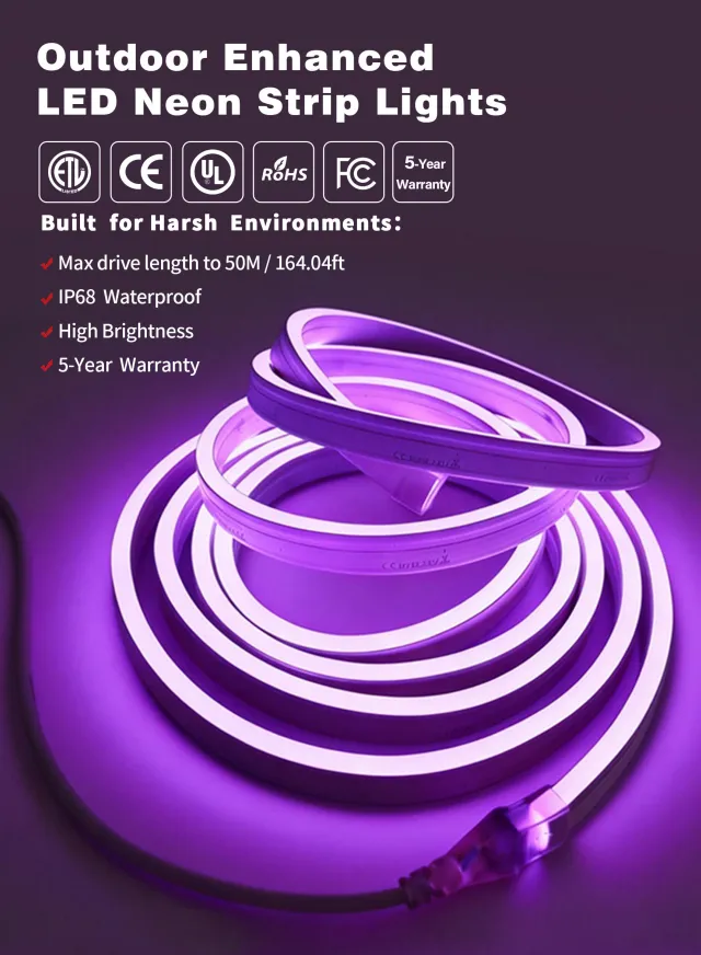 屋外強化版をご紹介できることを嬉しく思います LEDネオンストリップライト最高の耐久性と性能基準を満たすように設計された、プロ仕様の屋外照明ソリューション。特に過酷な屋外環境向けに開発されました。