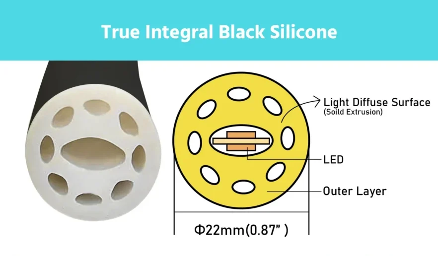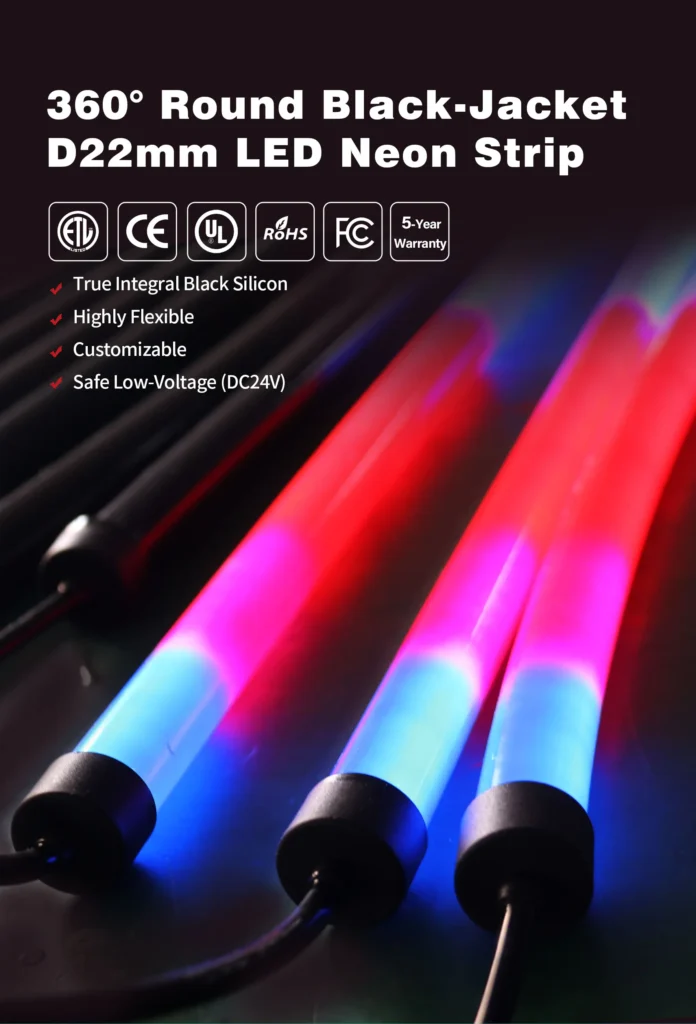 Wilgex presents the 360° Round Black-Jacket D22mm LED Neon Strip — a premium silicone neon flex engineered to deliver uniform, full-angle illumination with exceptional durability, safety certifications, and installation flexibility. Designed and manufactured for professional lighting contractors, architects, and project engineers, this product sets a new benchmark for high-performance linear lighting in demanding environments.