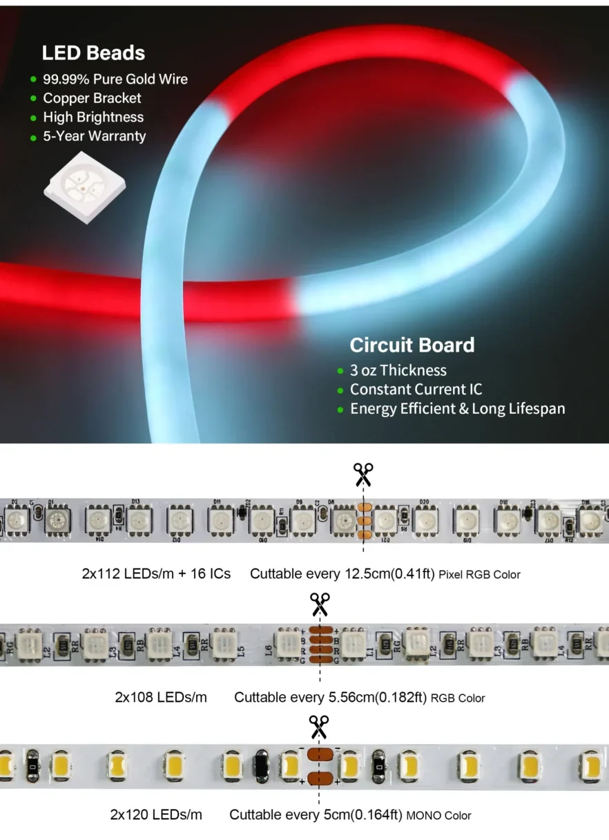 At the heart of the D22mm LED neon strip lies an innovative double-sided PCB structure, housed within a 360° rounded silicone extrusion, which enables full-angle bright lighting without any dark zones or visible light spots. This design perfectly replicates the continuous glow of traditional glass neon while eliminating its fragility, high-voltage hazards, and energy inefficiency.