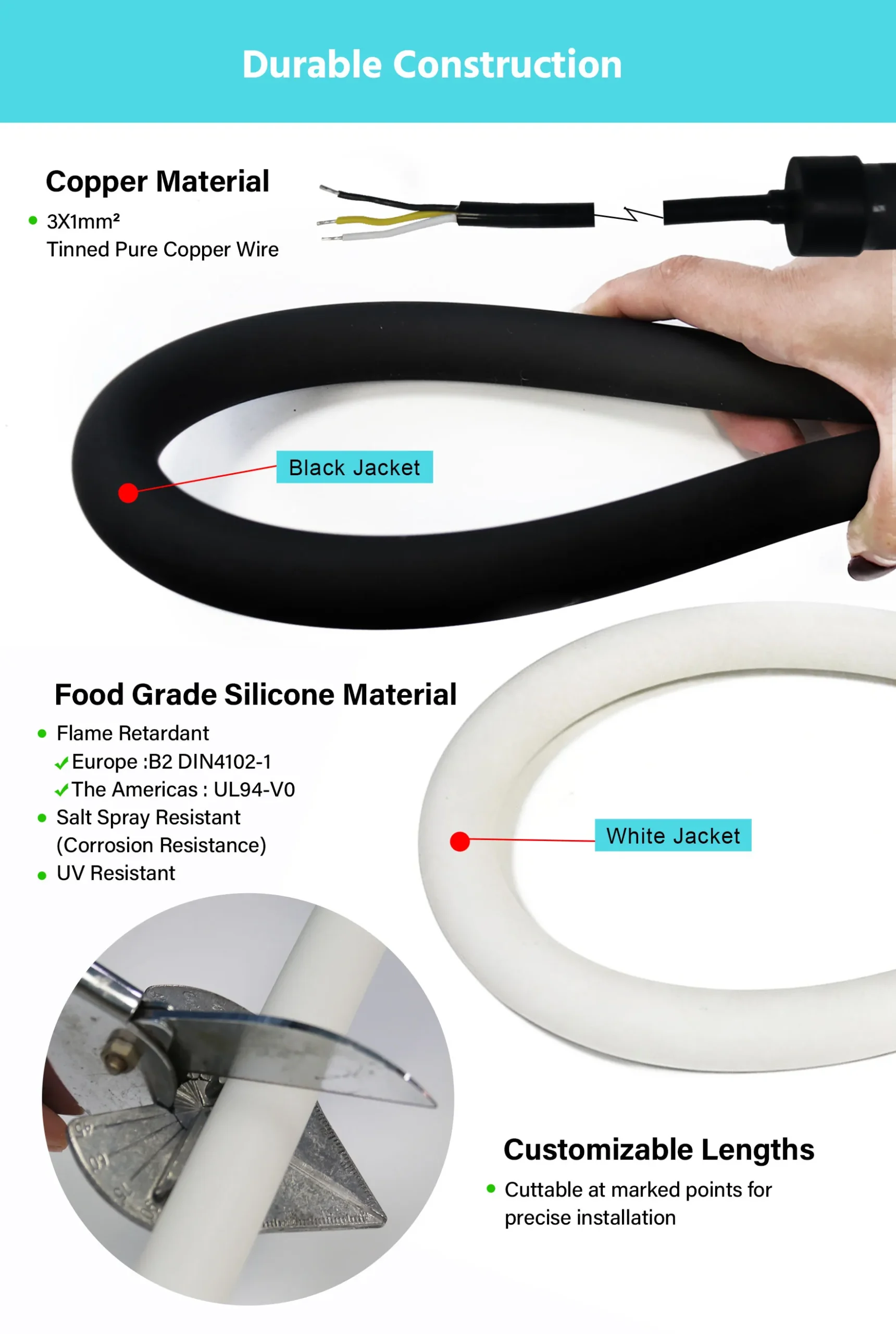 Salt Spray Resistance (Corrosion Protection): Tested in accordance with ASTM B117 standards, the silicone material withstands prolonged exposure to saline environments without degradation, making the strip suitable for coastal installations, marine applications, and swimming pool perimeters.