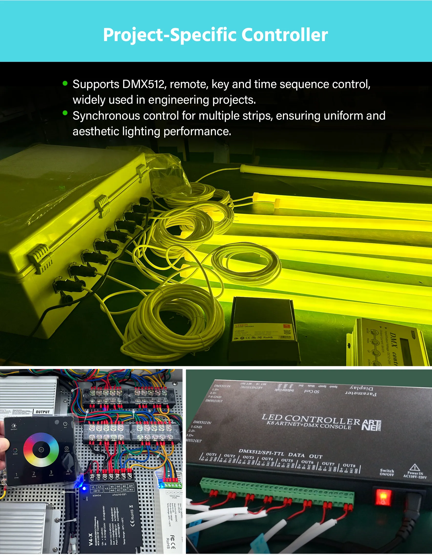 For large-scale commercial projects and architectural installations, control capability is as important as light quality. The Wilgex D22mm LED neon strip is fully compatible with project-specific controllers supporting multiple protocols and interfaces, including: