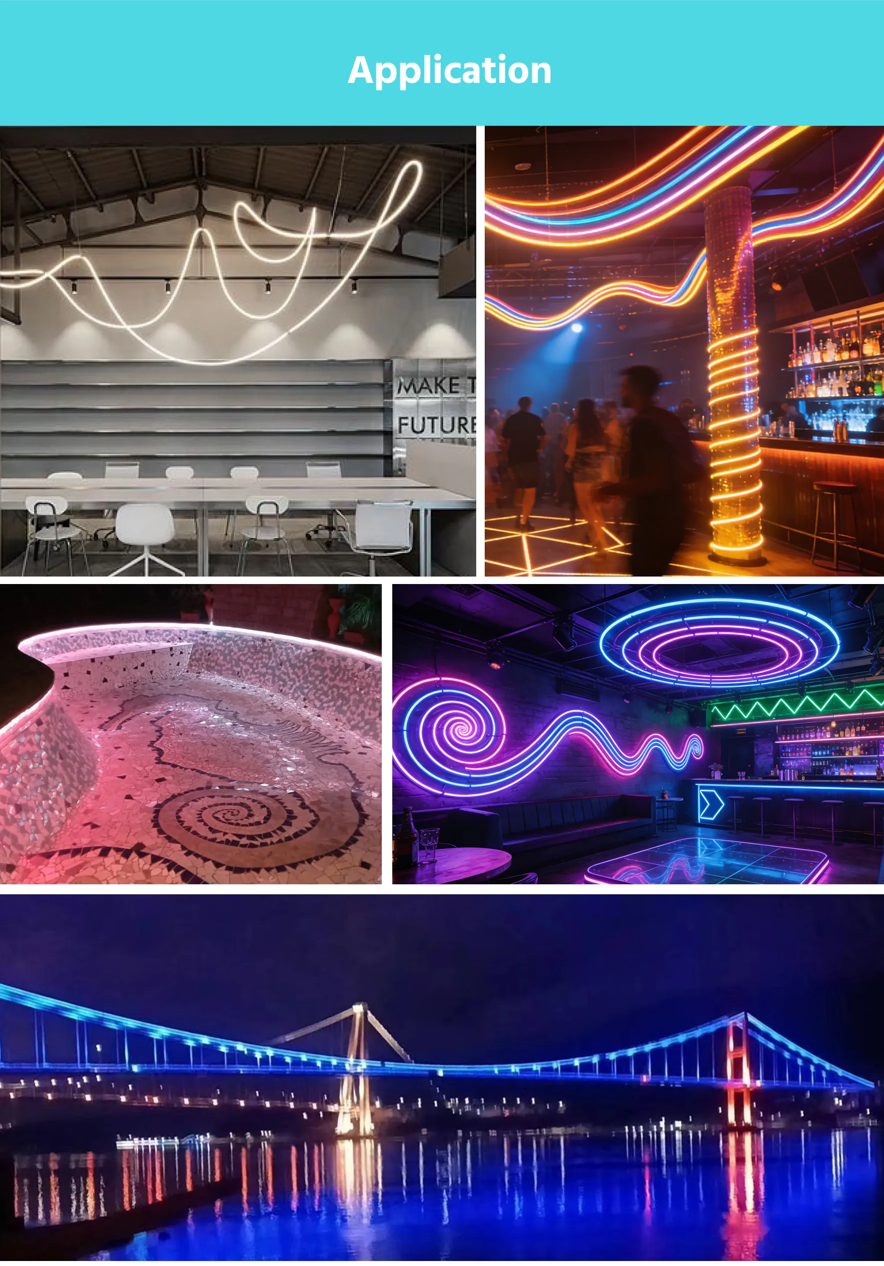 The D22mm LED neon strip combines highly flexible construction with customizable lengths to accommodate projects of any scale. The strip can be freely bent into straight runs, sweeping curves, circular formations, and other specialty shapes without compromising light uniformity or structural integrity.